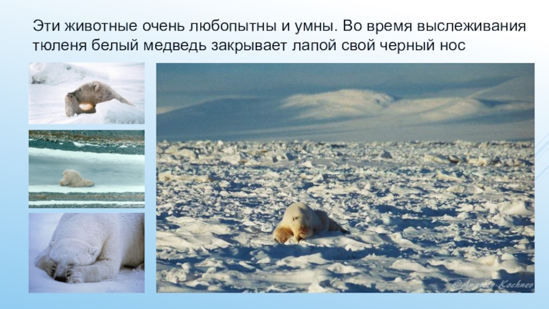 Слайд 10Эти животные очень любопытны и умны. Во время выслеживания тюленя белый