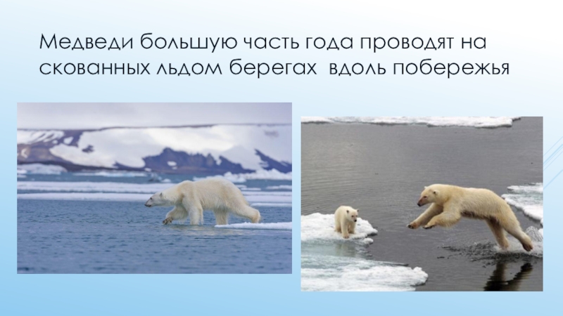 Слайд 8Медведи большую часть года проводят на скованных льдом берегах вдоль побережья