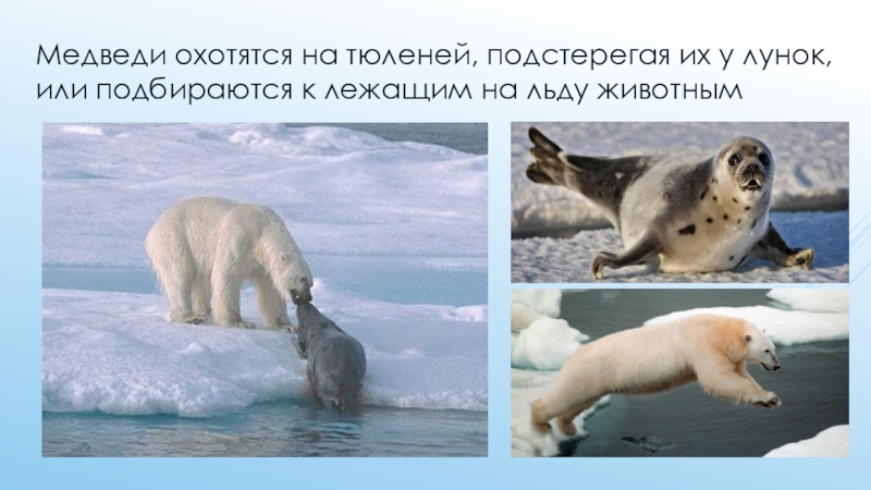 Слайд 9Медведи охотятся на тюленей, подстерегая их у лунок, или подбираются к