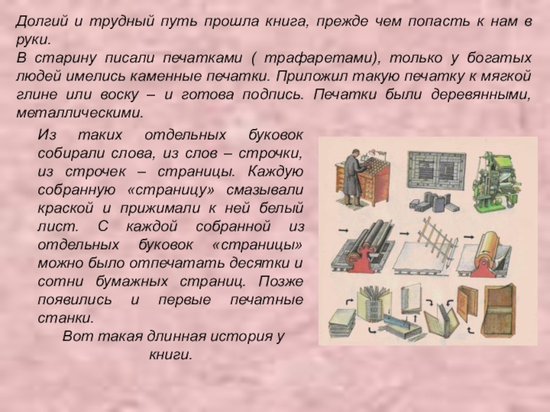 Из таких отдельных буковок собирали слова, из слов – строчки, из строчек – страницы. Каждую собранную «страницу» смазывали краской и прижимали к ней белый лист. С каждой собранной из отдельных буковок «страницы» можно было отпечатать десятки и сотни бумажных страниц. Позже появились и первые печатные станки.