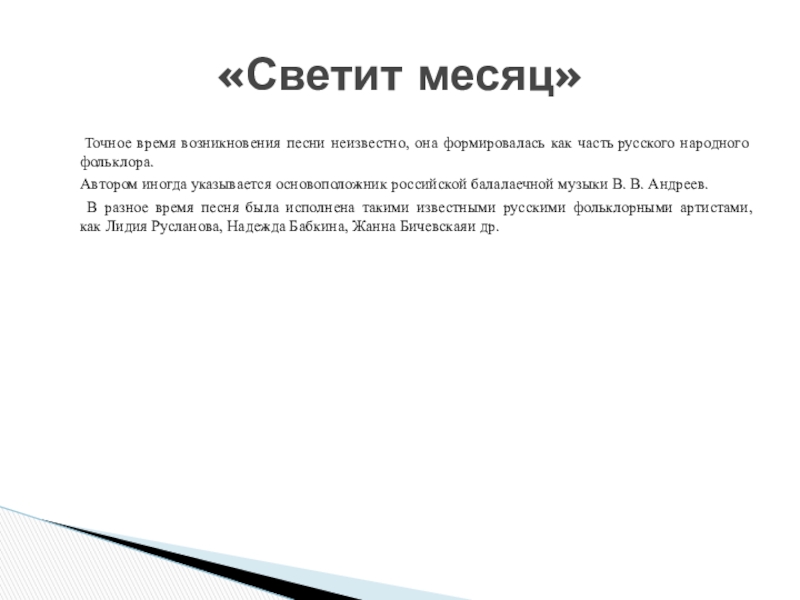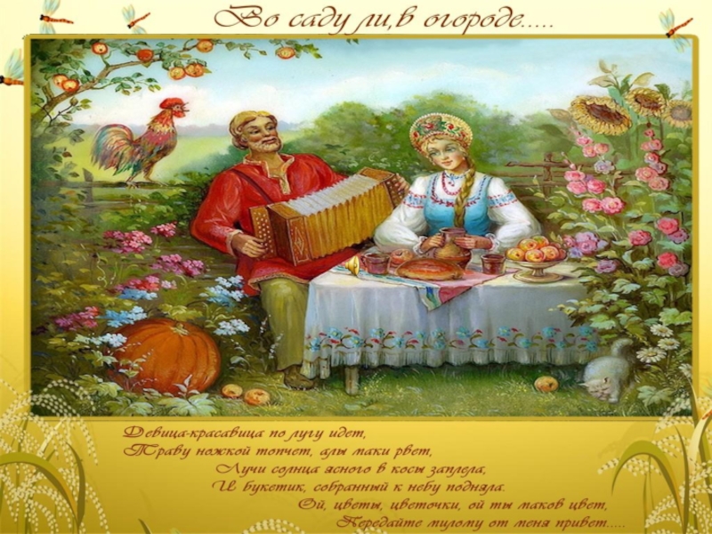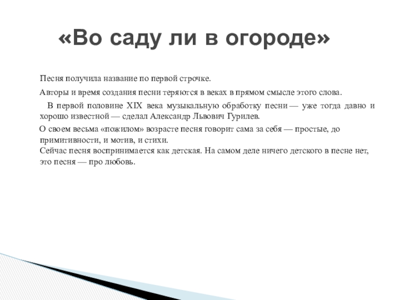 В тексте песни рассказывается история молодой девушки, которая вышла замуж по нужде за строго мужчину. Она хочет пойти в поле «белую берёзу заломати» и срезать «три пруточка», что бы сделать «три гудочка», а кроме них ещё и балалайку. Цель всех действий – «Встань ты, мой старый, проснись». То есть девушка будит мужа и помогает ему привести себя в порядок.