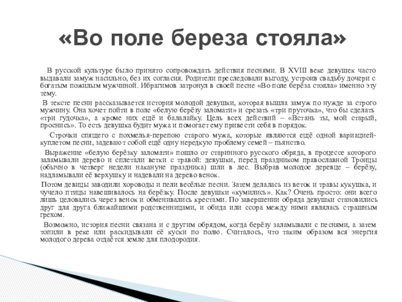 В XVIII веке девушек часто выдавали замуж насильно, без их согласия. Родители преследовали выгоду, устроив свадьбу дочери с богатым пожилым мужчиной. Ибрагимов затронул в своей песне «Во поле берёза стояла» именно эту тему.
