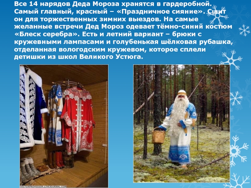 – «Праздничное сияние». Сшит он для торжественных зимних выездов. На самые желанные встречи Дед Мороз одевает тёмно-синий костюм «Блеск серебра». Есть и летний вариант – брюки с кружевными лампасами и голубенькая шёлковая рубашка, отделанная вологодским кружевом, которое сплели детишки из школ Великого Устюга.