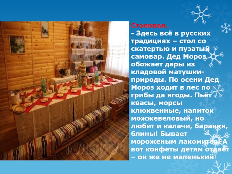 пузатый самовар. Дед Мороз обожает дары из кладовой матушки-природы. По осени Дед Мороз ходит в лес по грибы да ягоды. Пьёт квасы, морсы клюквенные, напиток можжевеловый, но любит и калачи, баранки, блины! Бывает мороженым лакомится. А вот конфеты детям отдаёт – он же не маленький!
