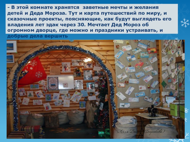 Деда Мороза. Тут и карта путешествий по миру, и сказочные проекты, поясняющие, как будут выглядеть его владения лет эдак через 30. Мечтает Дед Мороз об огромном дворце, где можно и праздники устраивать, и добрые дела вершить