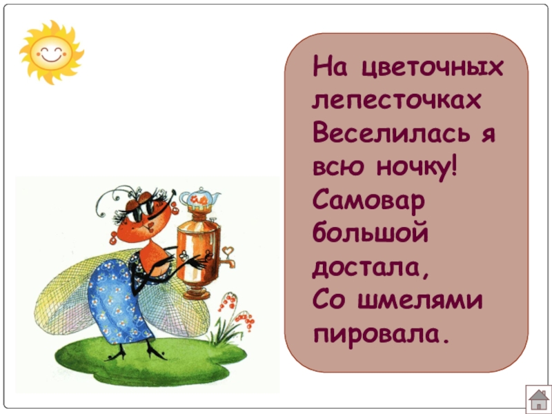 На цветочных лепесточках Веселилась я всю ночку! Самовар большой достала, Со шмелями пировала.