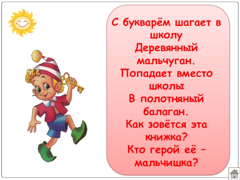 С букварём шагает в школу Деревянный мальчуган. Попадает вместо школы В полотняный балаган. Как зовётся эта книжка?