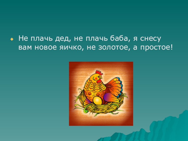 Слайд 21Не плачь дед, не плачь баба, я снесу вам новое яичко,