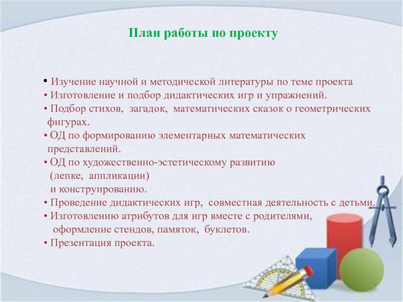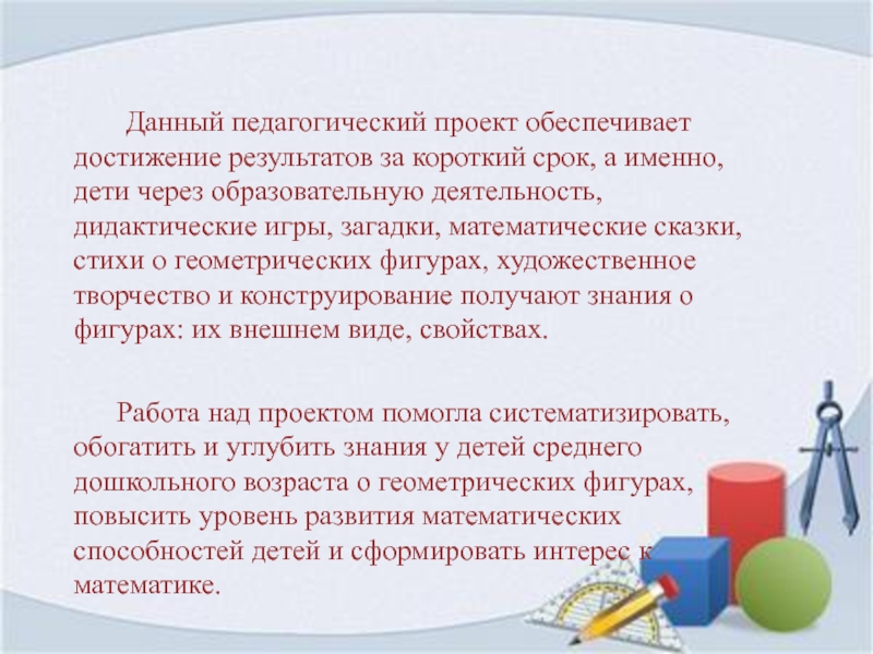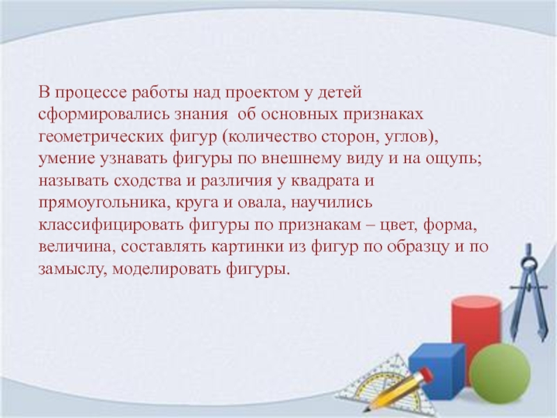 Работа над проектом помогла систематизировать, обогатить и углубить знания у детей среднего дошкольного возраста о геометрических фигурах, повысить уровень развития математических способностей детей и сформировать интерес к математике.