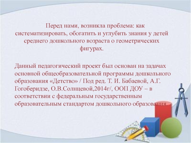 Данный педагогический проект был основан на задачах основной общеобразовательной программы дошкольного образования «Детство» / Под ред. Т. И. Бабаевой, А.Г. Гогоберидзе, О.В.Солнцевой,2014г/, ООП ДОУ – в соответствии с федеральным государственным образовательным стандартом дошкольного образования.