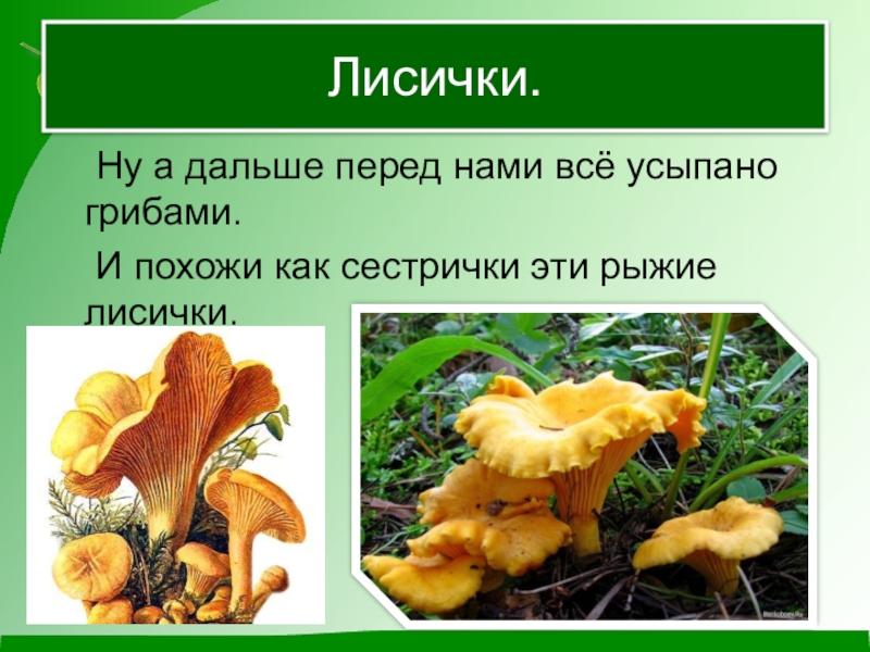 Лисички.	Ну а дальше перед нами всё усыпано грибами.	И похожи как сестрички эти рыжие лисички.