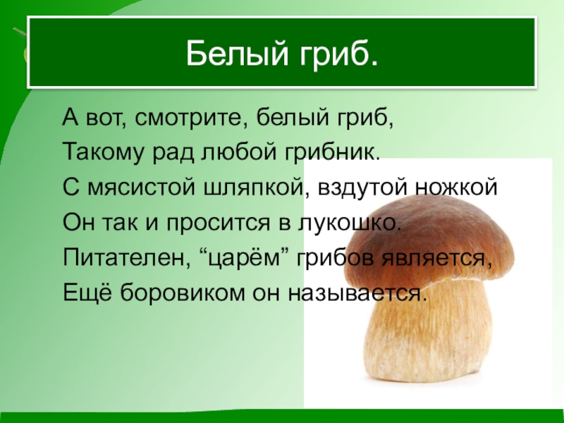 Белый гриб.	А вот, смотрите, белый гриб,	Такому рад любой грибник.	С мясистой шляпкой, вздутой ножкой	Он так и просится в