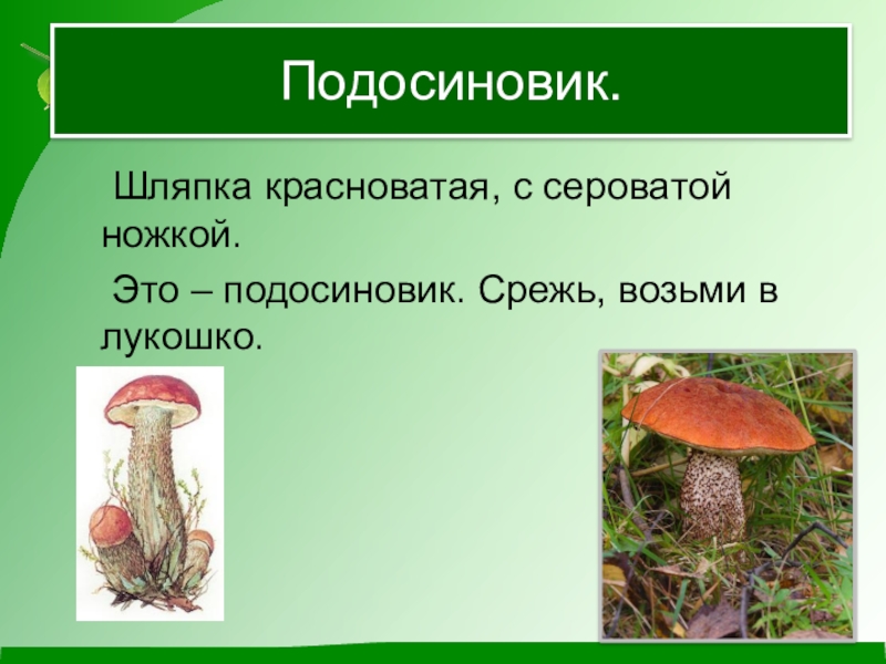 Подосиновик.	Шляпка красноватая, с сероватой ножкой.	Это – подосиновик. Срежь, возьми в лукошко.
