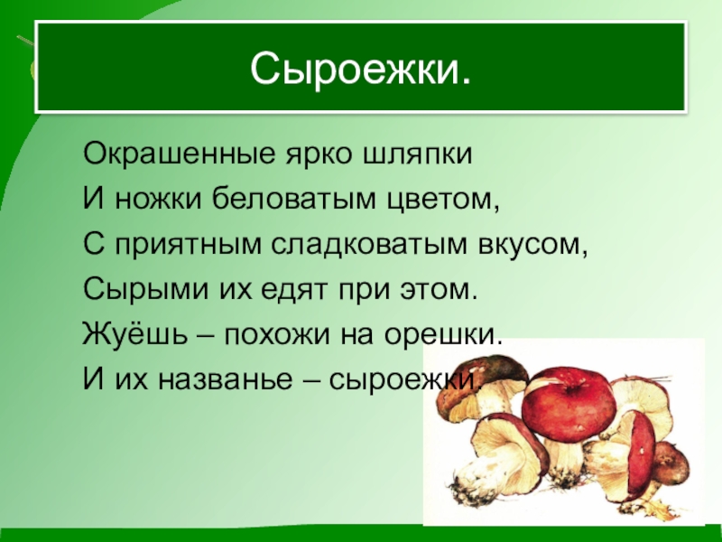 Сыроежки.	Окрашенные ярко шляпки	И ножки беловатым цветом,	С приятным сладковатым вкусом,	Сырыми их едят при этом.	Жуёшь – похожи на орешки.	И
