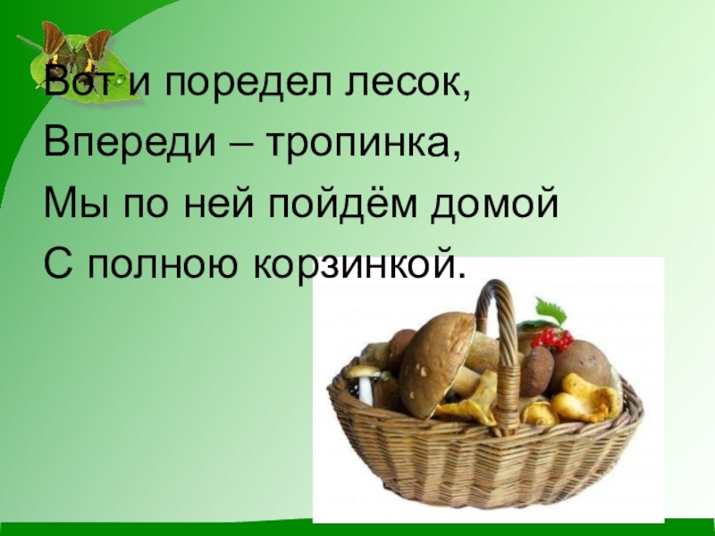 Вот и поредел лесок,Впереди – тропинка,Мы по ней пойдём домойС полною корзинкой.