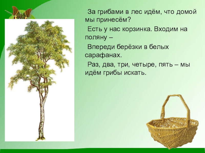 За грибами в лес идём, что домой мы принесём?	Есть у нас корзинка. Входим на поляну –	Впереди берёзки