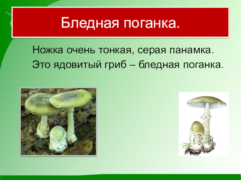 Бледная поганка.	Ножка очень тонкая, серая панамка.	Это ядовитый гриб – бледная поганка.