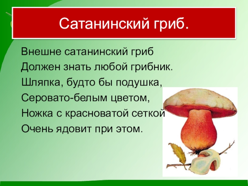 Сатанинский гриб.	Внешне сатанинский гриб	Должен знать любой грибник.	Шляпка, будто бы подушка,	Серовато-белым цветом,	Ножка с красноватой сеткой	Очень ядовит при этом.