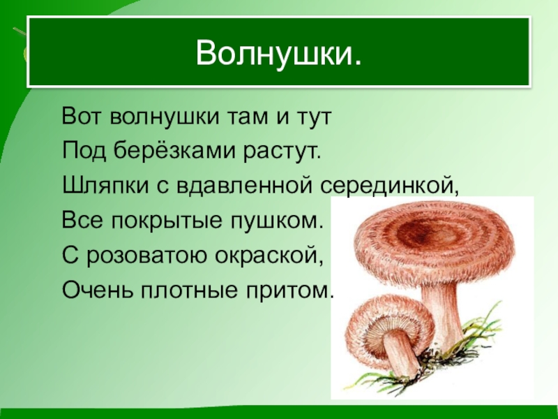 Волнушки.	Вот волнушки там и тут 	Под берёзками растут.	Шляпки с вдавленной серединкой,	Все покрытые пушком.	С розоватою окраской,	Очень плотные притом.