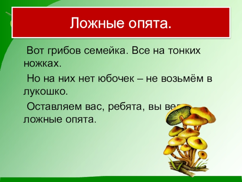 Ложные опята. 	Вот грибов семейка. Все на тонких ножках.	Но на них нет юбочек – не возьмём в