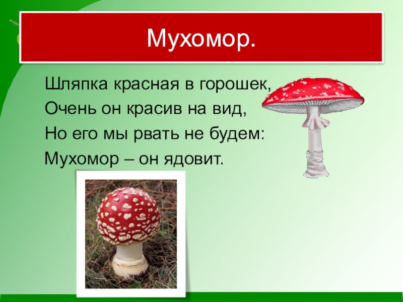 Мухомор.	Шляпка красная в горошек,	Очень он красив на вид,	Но его мы рвать не будем:	Мухомор – он ядовит.