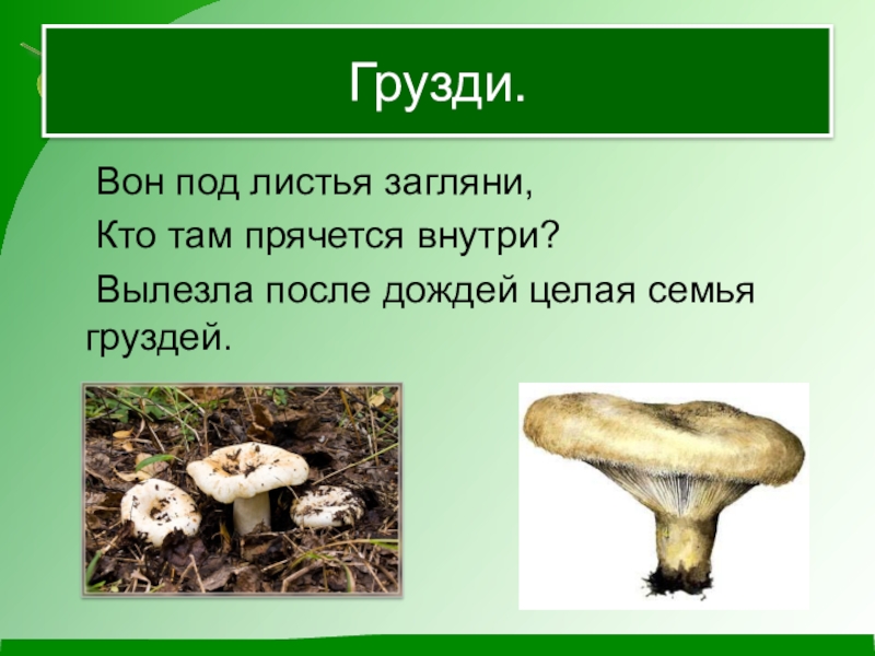 Грузди.	Вон под листья загляни,  Кто там прячется внутри? 	Вылезла после дождей целая семья груздей.