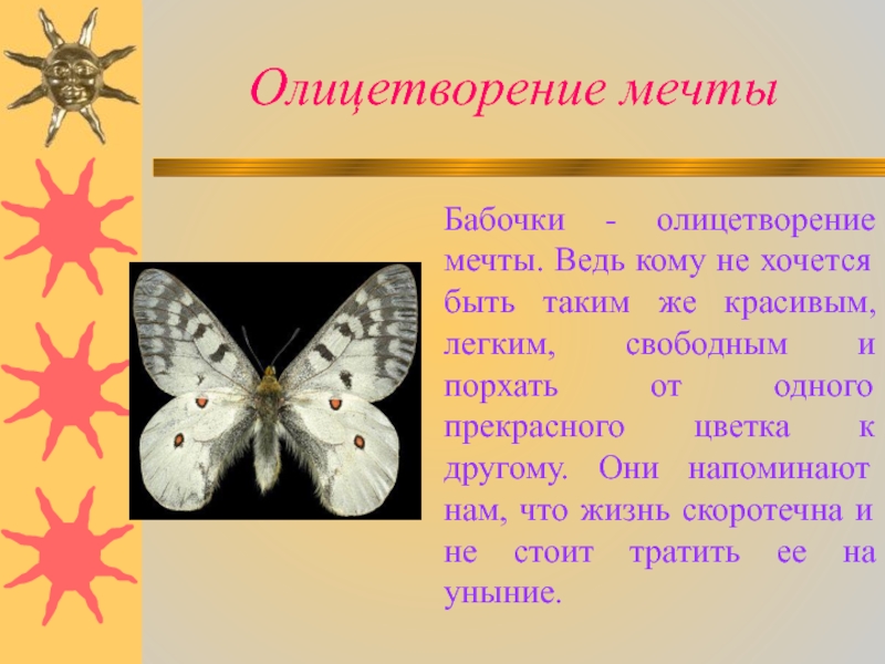 быть таким же красивым, легким, свободным и порхать от одного прекрасного цветка к другому. Они напоминают нам, что жизнь скоротечна и не стоит тратить ее на уныние.