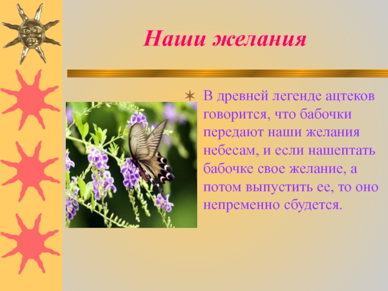 наши желания небесам, и если нашептать бабочке свое желание, а потом выпустить ее, то оно непременно сбудется.