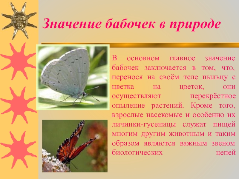 в том, что, перенося на своём теле пыльцу с цветка на цветок, они осуществляют перекрёстное опыление растений. Кроме того, взрослые насекомые и особенно их личинки-гусеницы служат пищей многим другим животным и таким образом являются важным звеном биологических цепей
