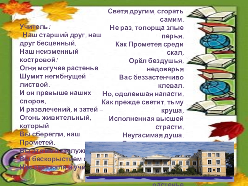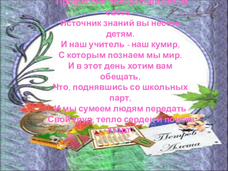 Это сайт презентаций, где можно хранить и обмениваться своими презентациями, докладами, проектами, шаблонами в формате PowerPoint с другими пользователями. Мы помогаем школьникам, студентам, учителям, преподавателям хранить и обмениваться учебными материалами.