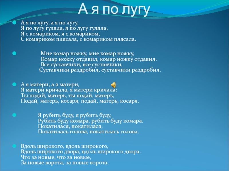 Я по лугу гуляла, я по лугу гуляла.