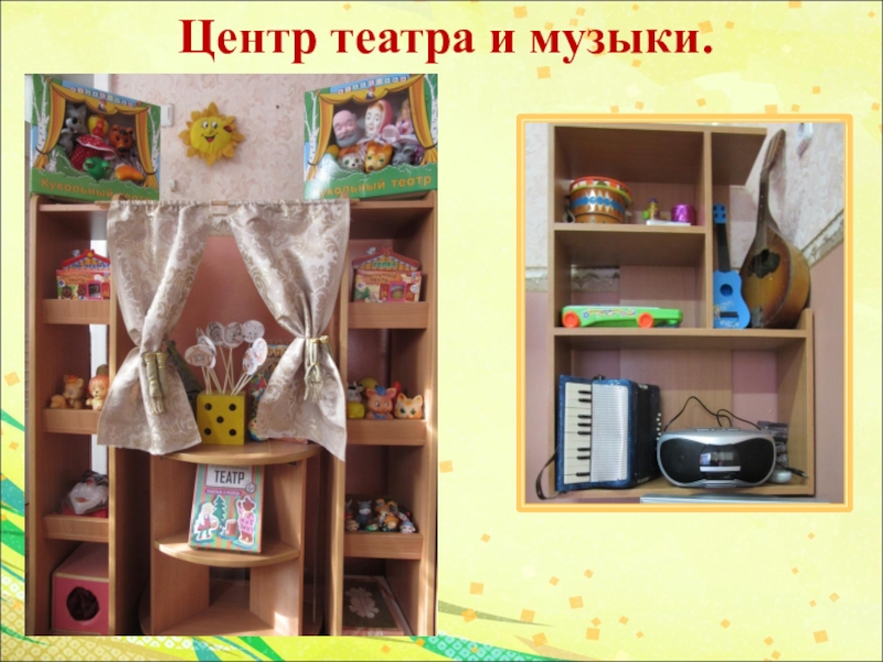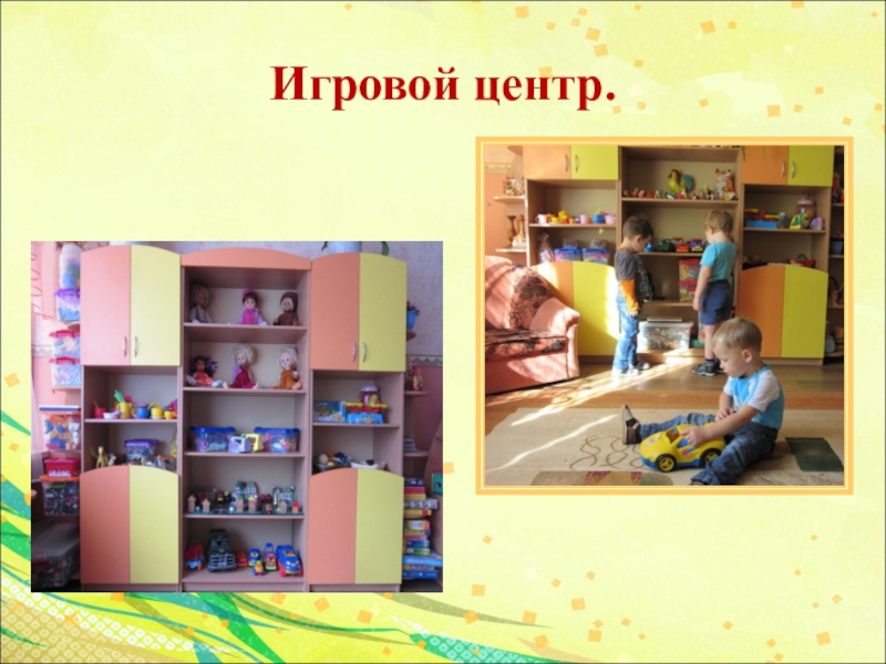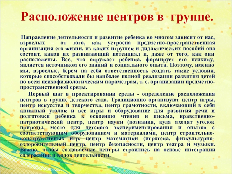 Первый шаг в проектировании среды - определение расположения центров в группе детского сада. Традиционно организуют центр игры, центр искусства и творчества, центр грамотности, включающий в себя книжный уголок и все игры и оборудование для развития речи и подготовки ребенка к освоению чтения и письма, нравственно-патриотический центр, центр науки (познания, куда входят уголок природы, место для детского экспериментирования и опытов с соответствующим оборудованием и материалами, центр строительно-конструктивных игр, центр математики (игротека, физкультурно-оздоровительный центр, центр безопасности, центр театра и музыки. Важно, чтобы создаваемые центры строились на основе интеграции содержания и видов деятельности.
