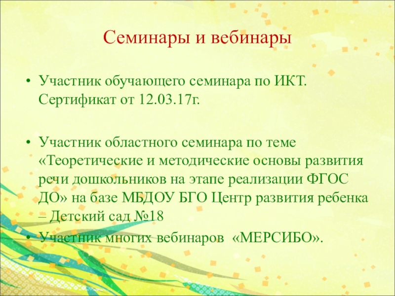 Участник обучающего семинара по ИКТ. Сертификат от 12.03.17г.