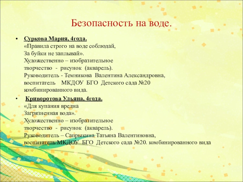 «Правила строго на воде соблюдай, За буйки не заплывай». Художественно – изобразительное творчество - рисунок (акварель). Руководитель - Темникова Валентина Александровна, воспитатель МКДОУ БГО Детского сада №20 комбинированного вида.