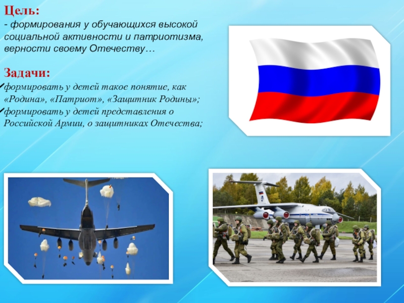 формировать у детей представления о Российской Армии, о защитниках Отечества;