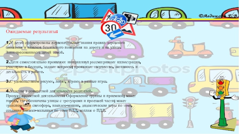 Ожидаемые результаты:1.У детей сформированы первоначальные знания правил дорожногодвижения и навыков безопасного поведения на дороге и на улице.Заинтересованность