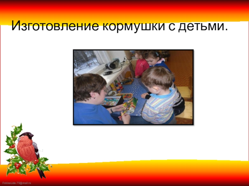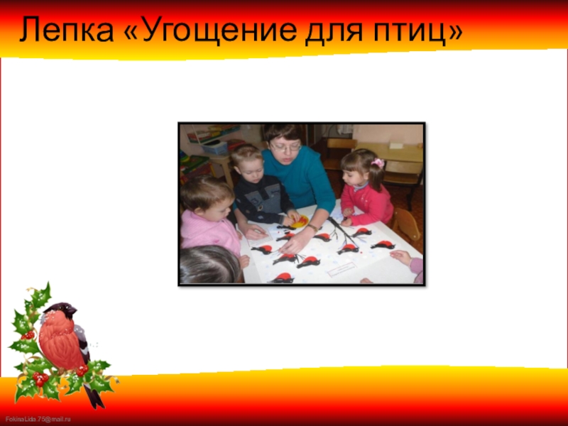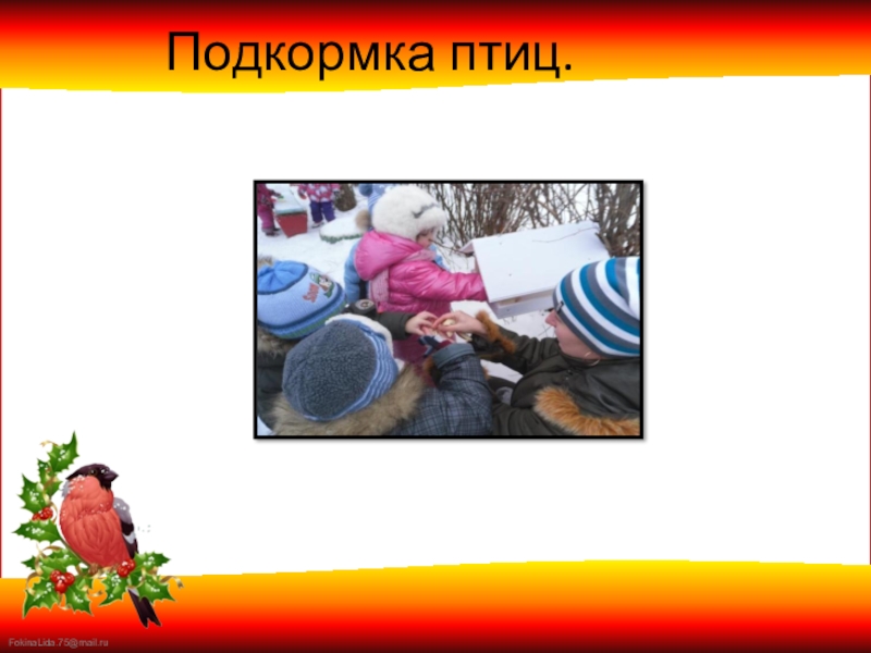 Доступной пищи становиться значительно меньше, но потребность в ней возрастает. Иногда естественный корм становится практически недоступным, поэтому многие птицы не могут пережить зиму и погибают. И только люди могут помочь птицам. Когда ночная температура падает до -10 градусов и ниже, синички за ночь теряют 10% собственного веса. Голодные, ослабевшие птицы быстро замерзают. А вот сытой птице и мороз не страшен. Вот и летят птицы поближе к жилью человека. Задача взрослых- воспитывать интерес у детей к птицам, желание узнавать новые факты их жизни, желание оказать им помощь.