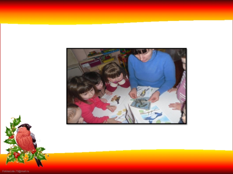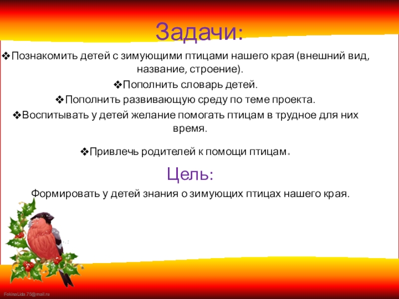 Задачи:Познакомить детей с зимующими птицами нашего края (внешний вид, название, строение).Пополнить словарь детей.Пополнить развивающую среду по теме
