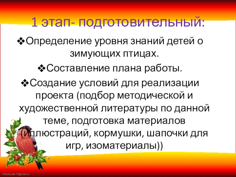 1 этап- подготовительный:Определение уровня знаний детей о зимующих птицах.Составление плана работы.Создание условий для реализации проекта (подбор методической