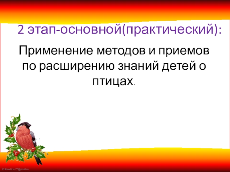 2 этап-основной(практический):Применение методов и приемов по расширению знаний детей о птицах.