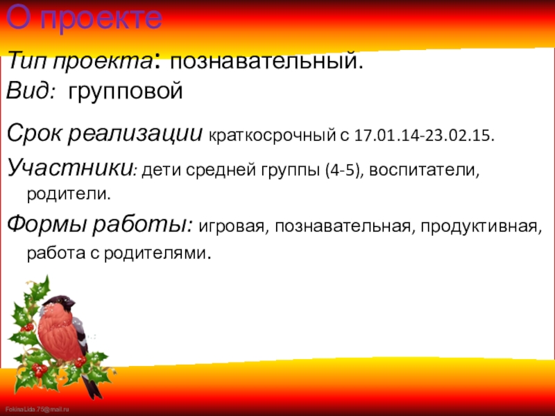 О проекте Тип проекта: познавательный. Вид: групповойСрок реализации краткосрочный с 17.01.14-23.02.15.Участники: дети средней группы (4-5), воспитатели, родители.Формы работы: игровая, познавательная, продуктивная, работа с родителями.