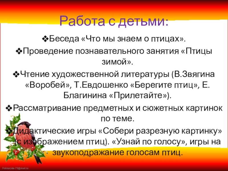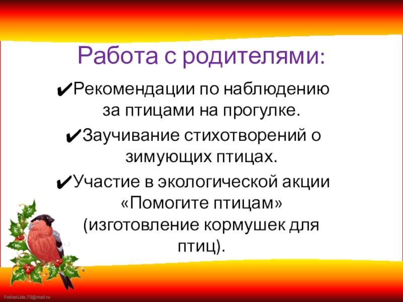 Работа с родителями:Рекомендации по наблюдению за птицами на прогулке.Заучивание стихотворений о зимующих птицах.Участие в экологической акции «Помогите