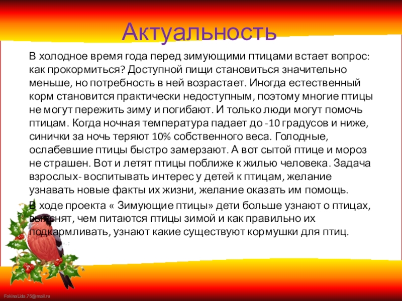 АктуальностьВ холодное время года перед зимующими птицами встает вопрос: как прокормиться? Доступной пищи становиться значительно меньше, но
