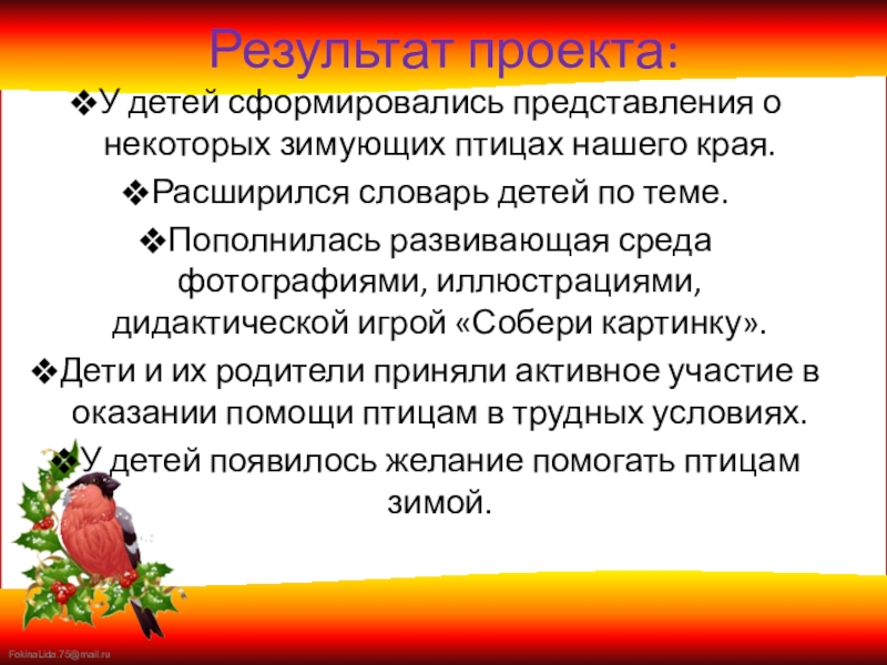 Результат проекта:У детей сформировались представления о некоторых зимующих птицах нашего края.Расширился словарь детей по теме.Пополнилась развивающая среда