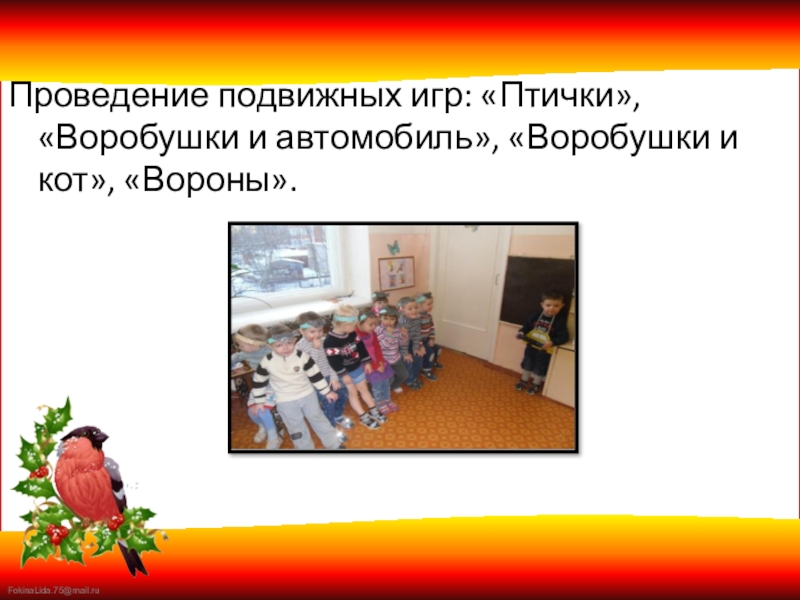 Слайд 11Проведение подвижных игр: «Птички», «Воробушки и автомобиль», «Воробушки и кот», «Вороны».