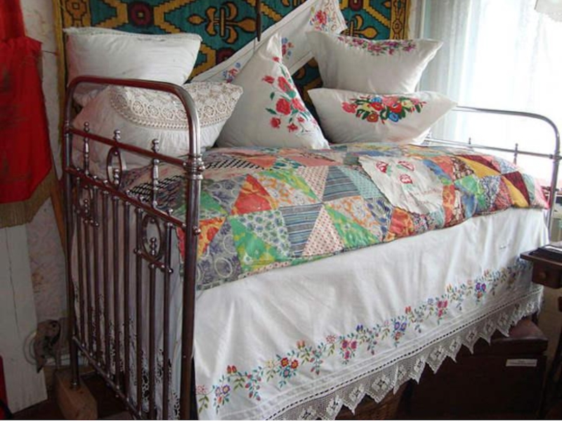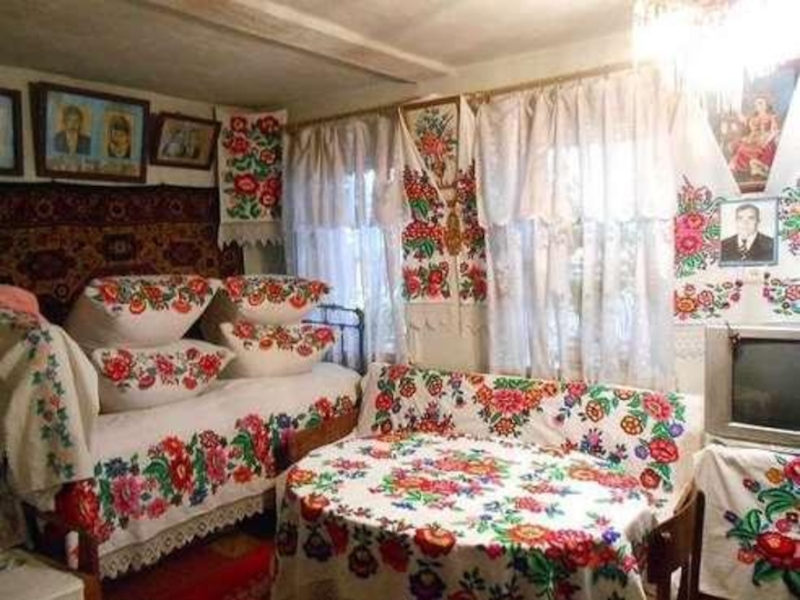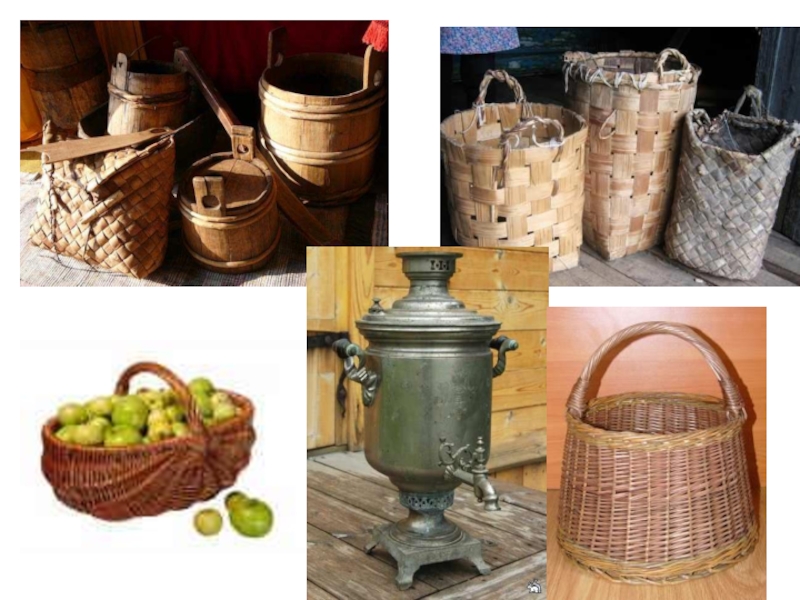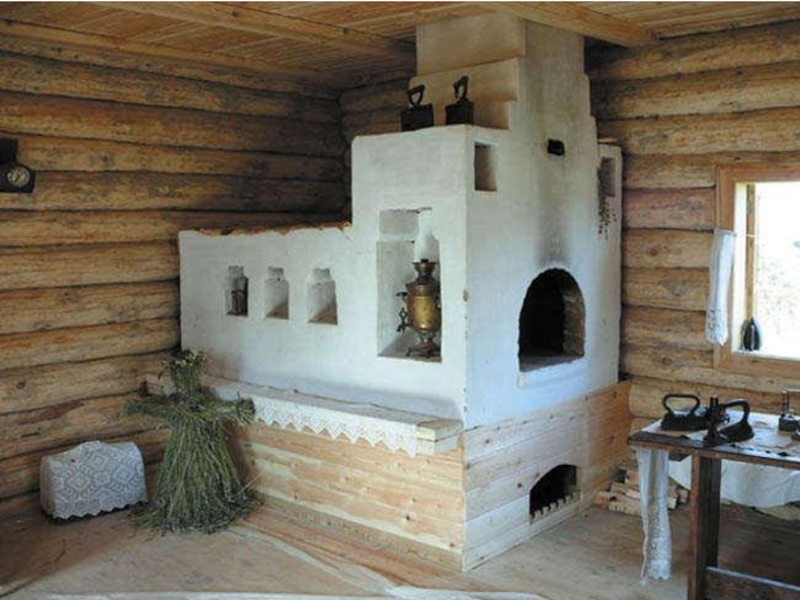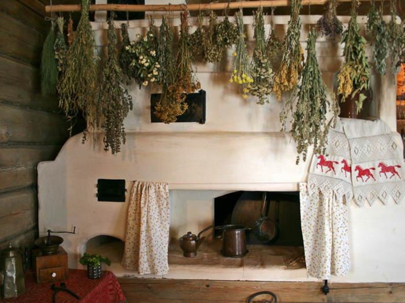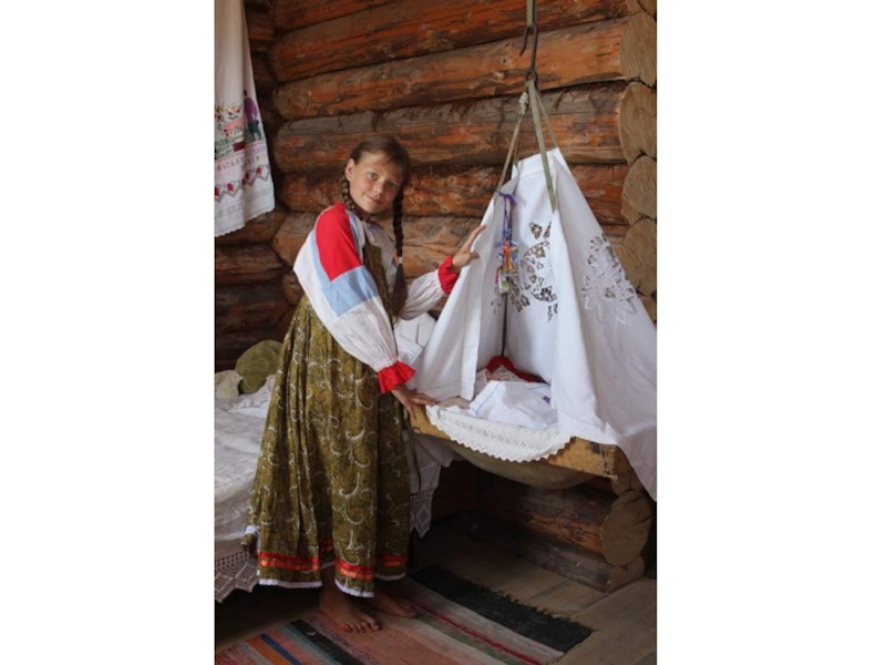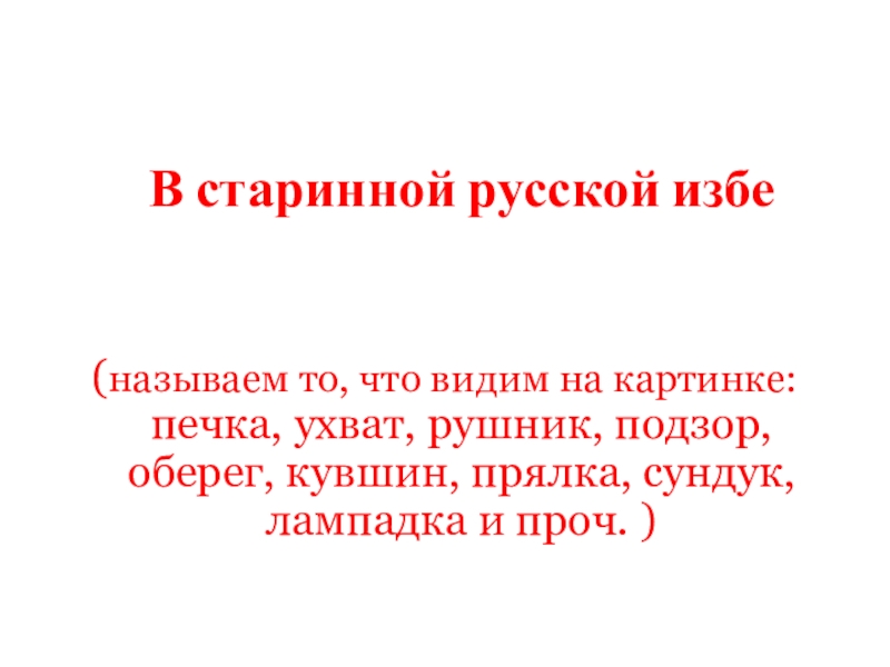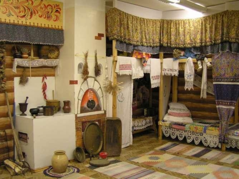 печка, ухват, рушник, подзор, оберег, кувшин, прялка, сундук, лампадка и проч. )