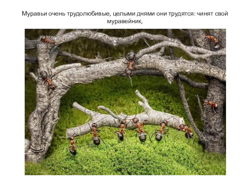 Слайд 11Муравьи очень трудолюбивые, целыми днями они трудятся: чинят свой муравейник,