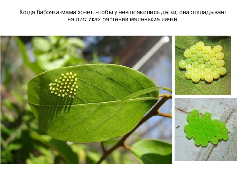 Когда бабочка-мама хочет, чтобы у нее появились детки, она откладывает на листиках растений маленькие яички.