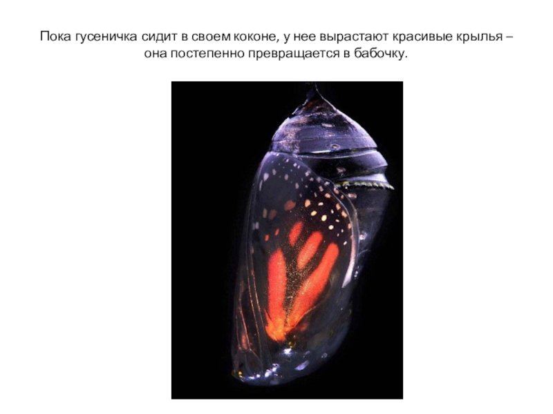 Слайд 30Пока гусеничка сидит в своем коконе, у нее вырастают красивые крылья