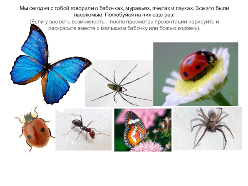 Мы сегодня с тобой говорили о бабочках, муравьях, пчелах и пауках. Все это были насекомые. Полюбуйся на